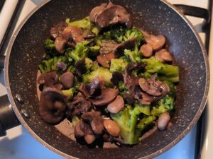 (FOTO1) In una padella fate rosolare lo spicchio d’aglio con dell’olio e se volete del peperoncino, aggiungete i funghi e fateli cuocere alcuni minuti, poi unite le cimette di broccoli lessate in precedenza, regolate di sale e fate insaporire il tutto per circa 10 minuti.